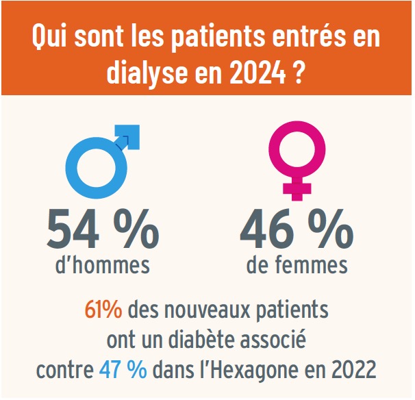 En 2024, les patients entrés en dialyse se répartissent en 54 % d’hommes et 46 % de femmes. Parmi eux, 61 % présentent un diabète associé, contre 47 % dans l’Hexagone en 2022.